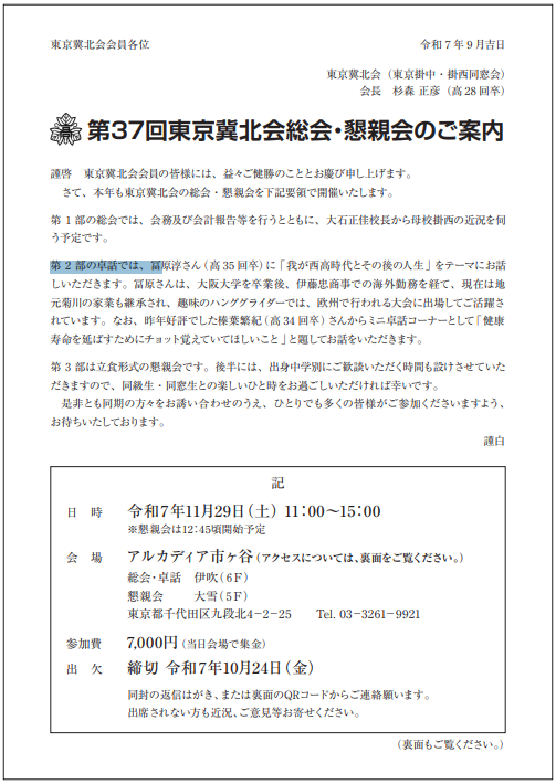 活動報告、決算報告等を行うとともに、大石正佳校長から母校掛西の近況を伺う予定です。